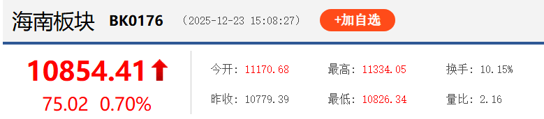 股市方面,23日收盘后,海南板块整体收于10854.41点,当日继续上升0.7%。