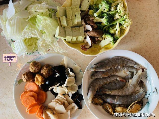 用料:北豆腐半块,大白菜、菜花、白木耳、黑木耳、香菇、大虾、鲍鱼、藕、胡萝卜、素丸子适量,葱末、蒜末、姜末、食用油、生抽、老抽、食盐适量制作过程:1、将北豆腐切方块;大白菜洗净后将白菜帮与白菜叶分离:白菜帮斜刀切成片、白菜叶撕成小片;菜花洗净掰小朵;白木耳、黑木耳泡发后洗净;香菇、胡萝卜洗净后切片、藕洗净后切片、大虾去虾线、虾枪和虾脚,鲍鱼去壳去肠切花刀备用。