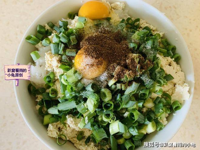 2、 北豆腐捏碎,小葱洗净切碎,一起放入大碗中,再打入2个鸡蛋,加入适量盐、花椒粉,然后戴上一次性手套,将碗中食材抓拌均匀。