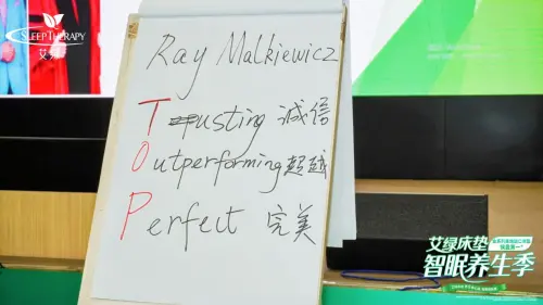 陈博士结合多年行业经验,强调“努力拼搏精神”,鼓舞士气,振奋精神他还讲述了艾绿床垫的T-O-P理念,让人更深刻意识到艾绿的精髓