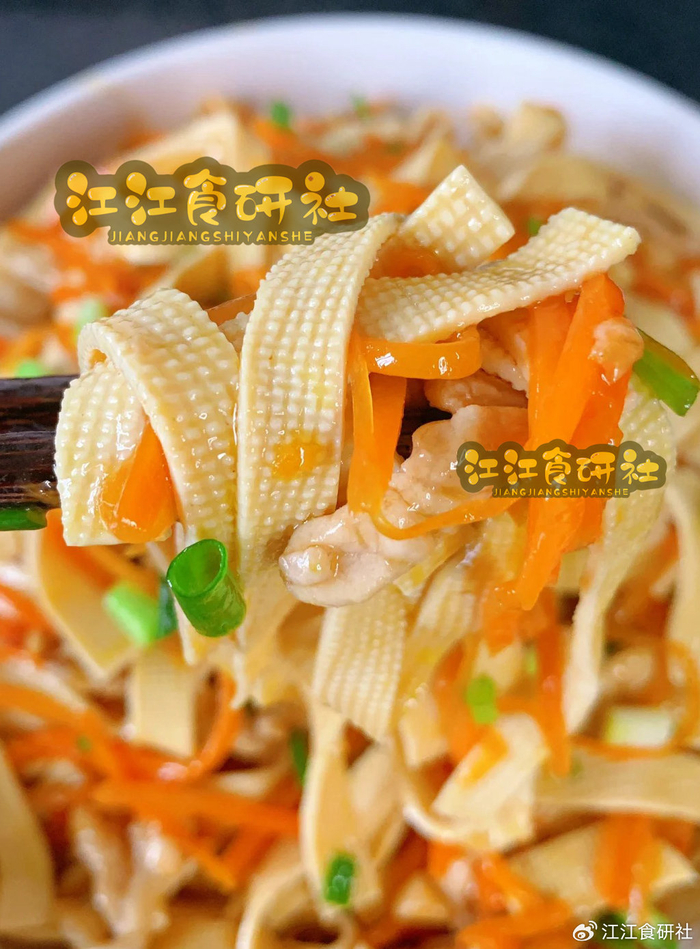 第二道:千张胡萝卜丝炒肉——家常的“温暖担当”这是最下饭的做法。肉丝的鲜,胡萝卜的甜,千张的软,在热锅里交融。秘诀在于,让千张从“配角”变成吸汁的“主角”。