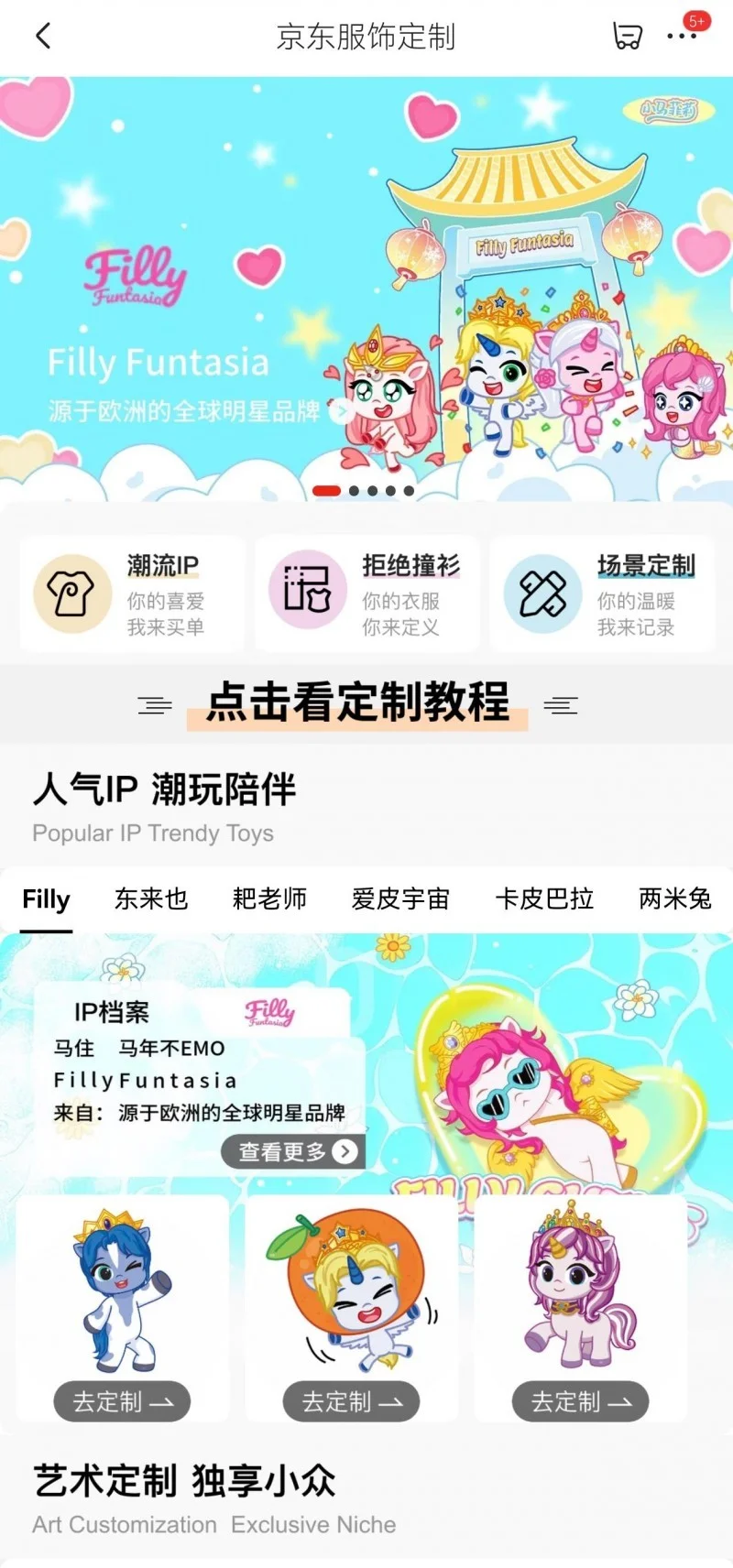联名款引爆品牌热度通过京东APP搜索“京东服饰定制”直达频道,多样化的IP选择是联名款合作的良好基础。而小马菲莉IP涵盖原创性、话题性、美观性的表现,足以满足全年龄动漫迷的需求。