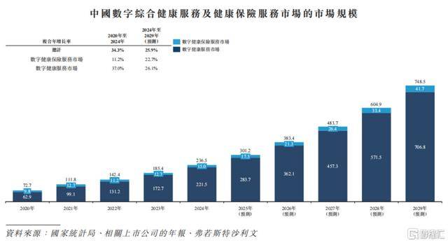 (资料来源:招股书)将视角拉长,技术驱动的正向增长循环,正与持续拓宽的行业空间形成共振弗若斯特沙利文数据显示,我国数字健康销售的渗透率预计将由2024年的2.8%增至2029年的7.1%,数字健康保险销售渗透率则将由2024年的7.2%提升至2029年的12.9%;按收入计算,中国数字综合健康服务及健康保险服务的市场规模将由2024年的2365亿元增至2029年的7485亿元,年复合增长率高达25.9%。