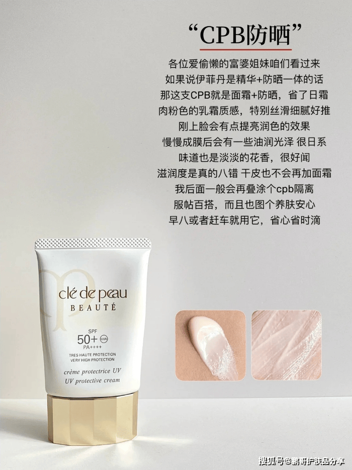 轻薄的酸奶质地,水水润润的很好推开,成膜速度也很快,而且还是防水防汗的,流汗也不怕掉,用下来感觉脸蛋都变得透亮细腻了不少用下来给我最大感觉是防晒、淡斑、妆前隔离它都可以第四款:CPB防晒大佬真的号称防晒界的爱马仕,全肤质通用,防晒+养肤+抗老三合一,抵御紫外线的同时还能抗老,并且隔绝蓝光从而抵御肌肤氧化,还可以提高皮肤的自适应内防御,防止晒红晒伤,很适合户外运动的姐妹。