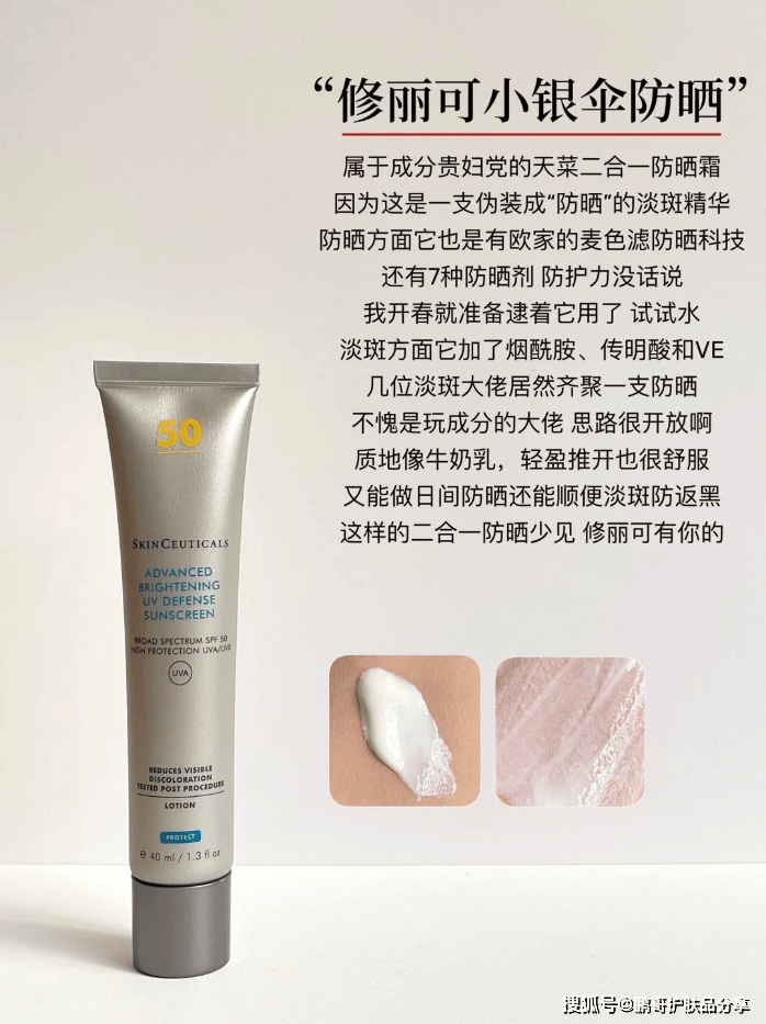 皮肤状态好的话后续跟个粉饼就行,妆感不重但又保留了一定的原生感,能盖住熬完夜的疲惫和肤色不均,看起来像妈生好皮似的通透亮堂,但一定要等成膜后再继续跟妆哦,不然有搓泥风险第三款:修丽可小银伞防晒防晒指数SPF50+、PA++++,高倍防晒的同时兼顾了米白的工作,相当于“越晒越白“啊,有着七重防晒剂复配,UVA+UVB的全波段防护,加上2%的烟酰胺+1%的传明酸+VC,很适合肌肤上有晒斑、痘印的姐妹。
