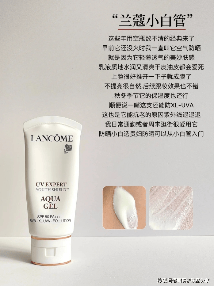 用它完全不怕晒黑晒老了,里面还有养肤成分帮助修护k氧化,皮肤敏敏的时候用它也是一整个安心住了上脸像精华一样轻盈水润,推开不泛白不搓泥第二款:兰蔻小白管防晒防晒指数SPF50、PA++++,日常通勤、户外活动都能用,不仅防晒黑晒红,里面的4重防晒剂,还能把光老化也堵在门外。