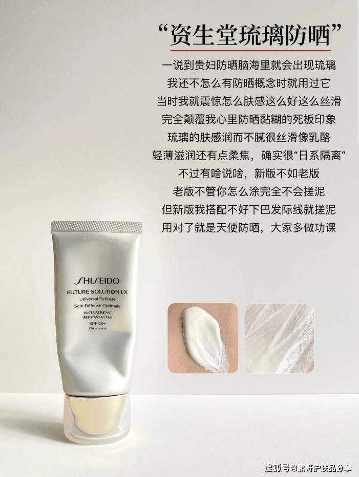 养肤型的防晒霜,平时懒得化妆可以直接涂它,自然提亮效果不会泛白,显得气色本来就很好的感觉,淡粉色的乳霜质地成膜后自带光泽,用作妆前打底也很不错,沙漠大干皮会很爱第五款:资生堂琉璃防晒资生堂的时光琉璃系列,作为其高端奢华系列的代表,首先在包装上就让人眼前一亮。