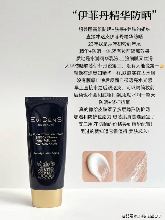 第一款:伊菲丹精华防晒防晒指数SPF50、PA++++,贵妇防晒用了很多,这支的使用感真的是无可取代的,作为混油敏肌,它带来的呵护感不仅停留在高倍防晒值,更是从肤感到成膜后的状态上都next level。