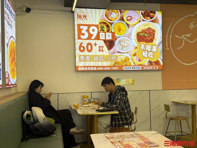 转转甜品+不限量畅吃,甜蜜经济升温11月27日,在长沙五一广场,拾光自助甜品小食店的门前总能看到驻足咨询的食客,门口显眼位置摆放的“39元/人,意面、甜品、小吃不限量畅吃”招牌格外吸睛“我们的餐品涵盖6大类70余个品种,从咸口的意面小吃到甜蜜的传统糖水,从网红甜品到冰爽饮品,能满足不同食客的口味需求。