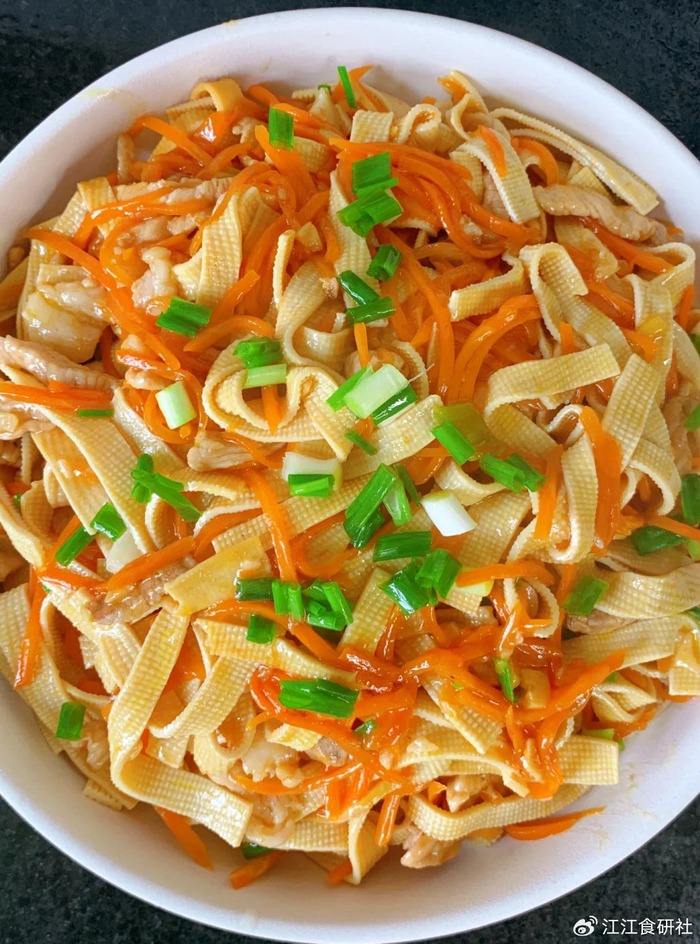 第二道:千张胡萝卜丝炒肉——家常的“温暖担当”这是最下饭的做法。肉丝的鲜,胡萝卜的甜,千张的软,在热锅里交融。秘诀在于,让千张从“配角”变成吸汁的“主角”。