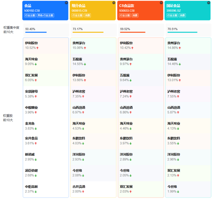 从前十大成分股看指数中证细分食品、CS食品、国证食品指数前十大权重股重叠度较高,均包含贵州茅台、五粮液、伊利股份、泸州老窖、山西汾酒、海天味业、东鹏饮料、洋河股份、今世缘,只是在权重分布上略有不同中证全指食品指数更有鲜明特色,。