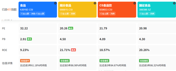 从估值和ROE维度看,中证全指食品指数PB(市净率)最低,为2.91,低于其他食品指数(4.00),或处于超跌区间(对应ETF:食品ETF华夏,代码:159151.SZ);细分食品指数的ROE表现最好,因为龙头占比高,经营稳健(对应ETF:食品饮料ETF,代码:515170.SH)。