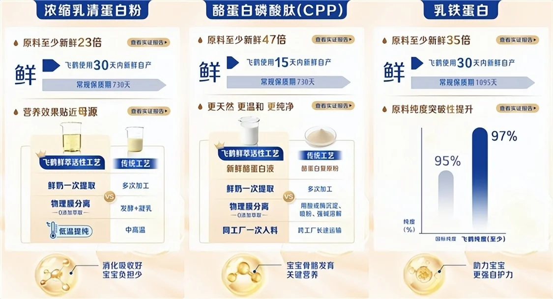 为解决这一痛点,飞鹤不仅应用全球领先的“鲜萃活性工艺”,实现11种关键原料100%自产能力,更坚持使用30天内自产鲜活原料,将原料“新鲜度”的计量单位从“年”缩短至“天”,真正实现从源头守护营养的安全与鲜活。