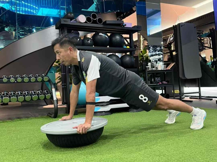 为了成为职业球员,张寒冰在健身房里减掉了近20斤体重(受访者供图) 为再拼一次,张寒冰主动收缩生意规模,足球成了他生活的绝对重心当然,他也不可能完全弃生意于不顾,不断在父亲、球员和商人三重身份之间切换:清晨送两个孩子上学,然后赶赴训练场;午休时趁着队友休息,他要赶回办公室处理订单、安排收发货;下午训练结束,要接上孩子回家。