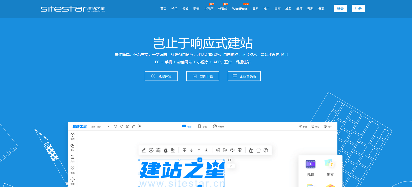 对中小企业来说的话,没有技术团队就是找第三方的开发,这个就成本会比较高一些那自助建站的话完全就是打破了这种开发的方式,它采用这种可视化的拖拽式的操作界面,我们操作起来就像 PPT 排版一样,非常简单没有不懂技术的人员的话,也能够快速地上手。